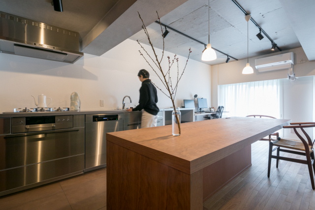LDKの中心にカウンターの広いアイランドキッチンを造作し、ゲストとの会話を楽しみながら料理やもてなしのできる空間に仕上げたキッチンリノベーション事例です。