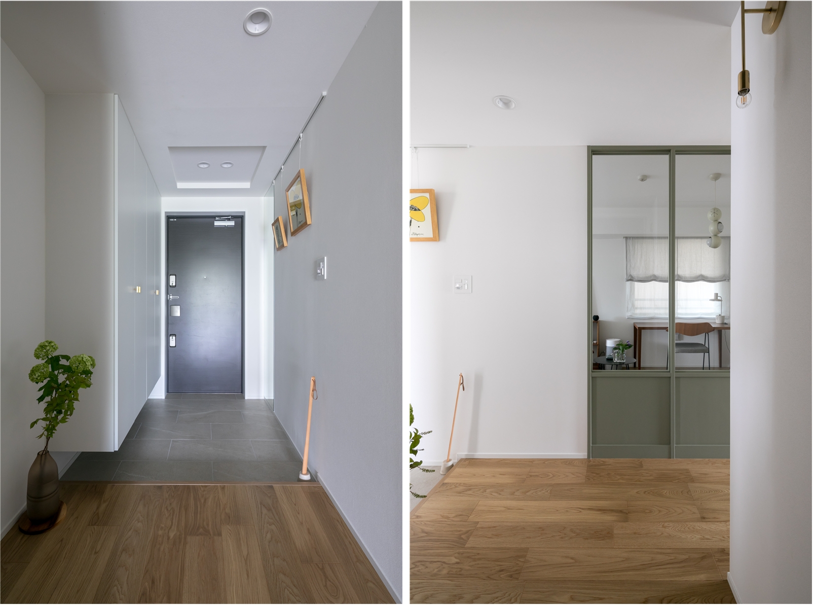 玄関と廊下の幅を広げ、LDKや洋室とガラス窓でつながることで、