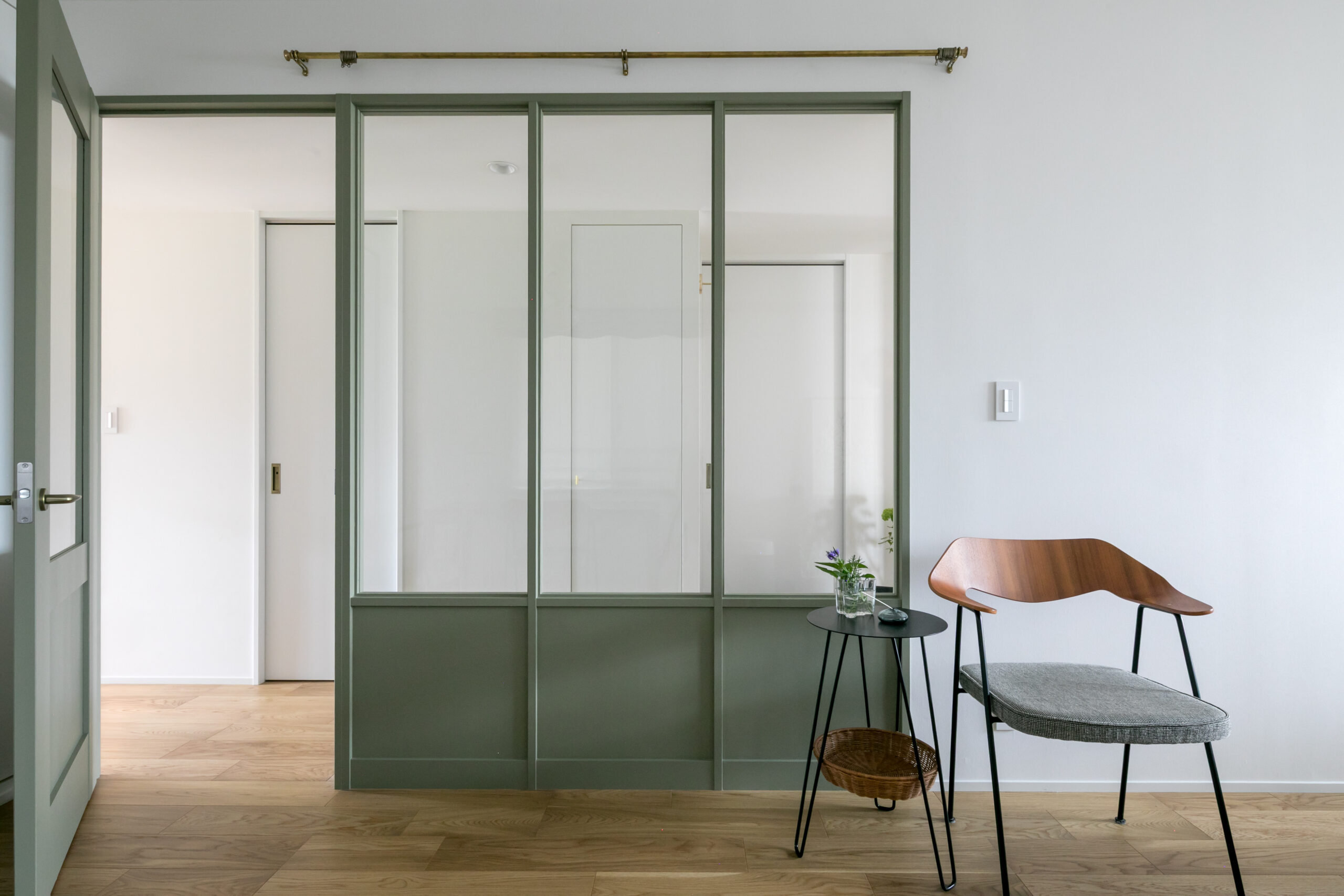 廊下とつながる採光窓は選び抜いた色〈モスグリーン〉を塗装し、