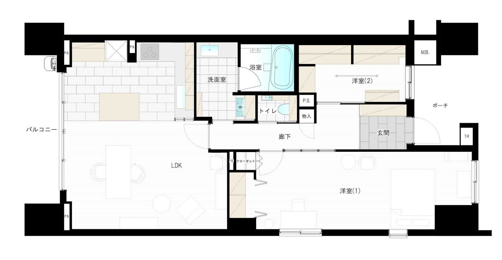LDKと洋室を一体的に改修し、2LDKの間取りに変更。
