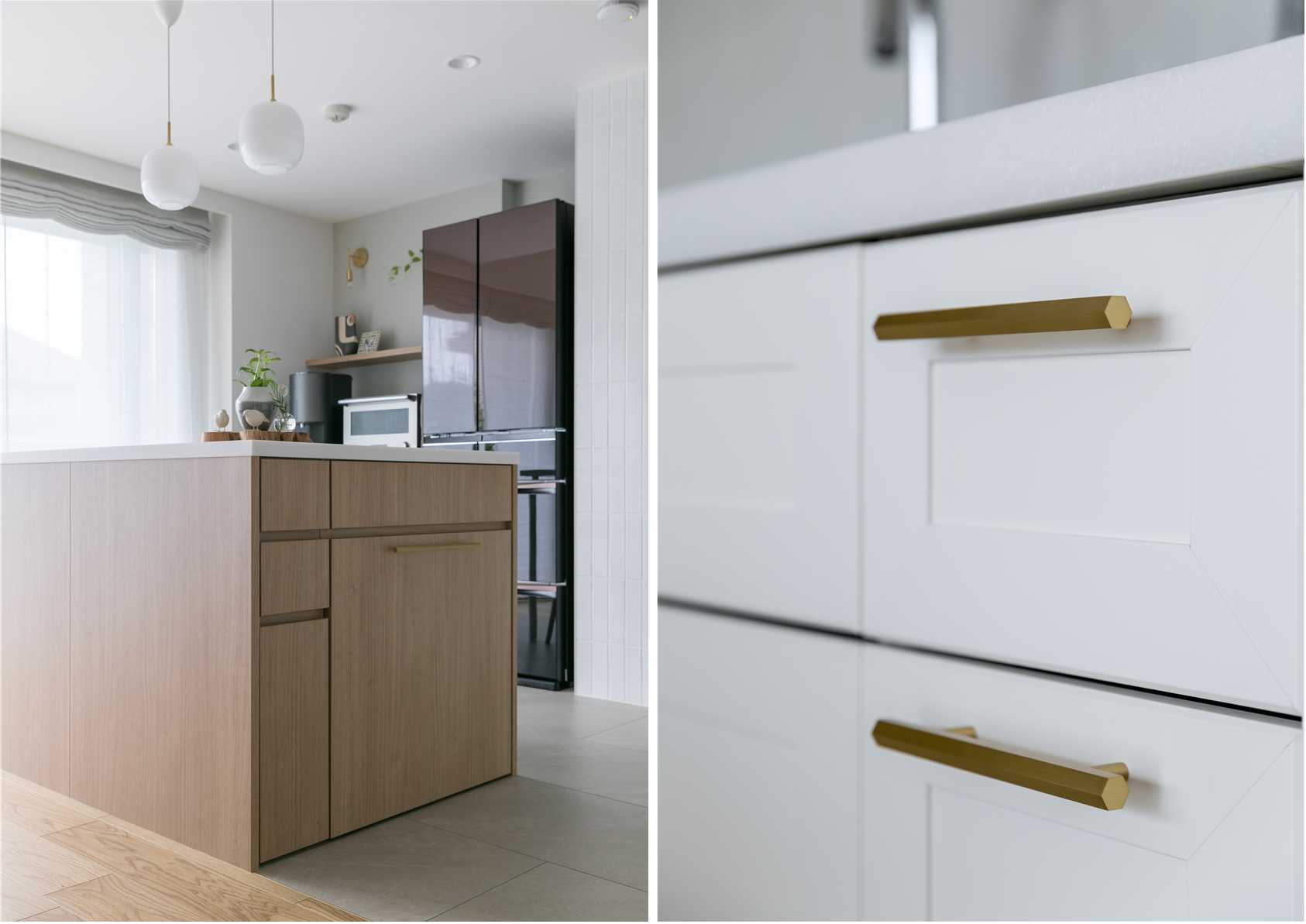 メーカー既製品のドアノブや取手を交換し、照明材と合わせた真鍮に。