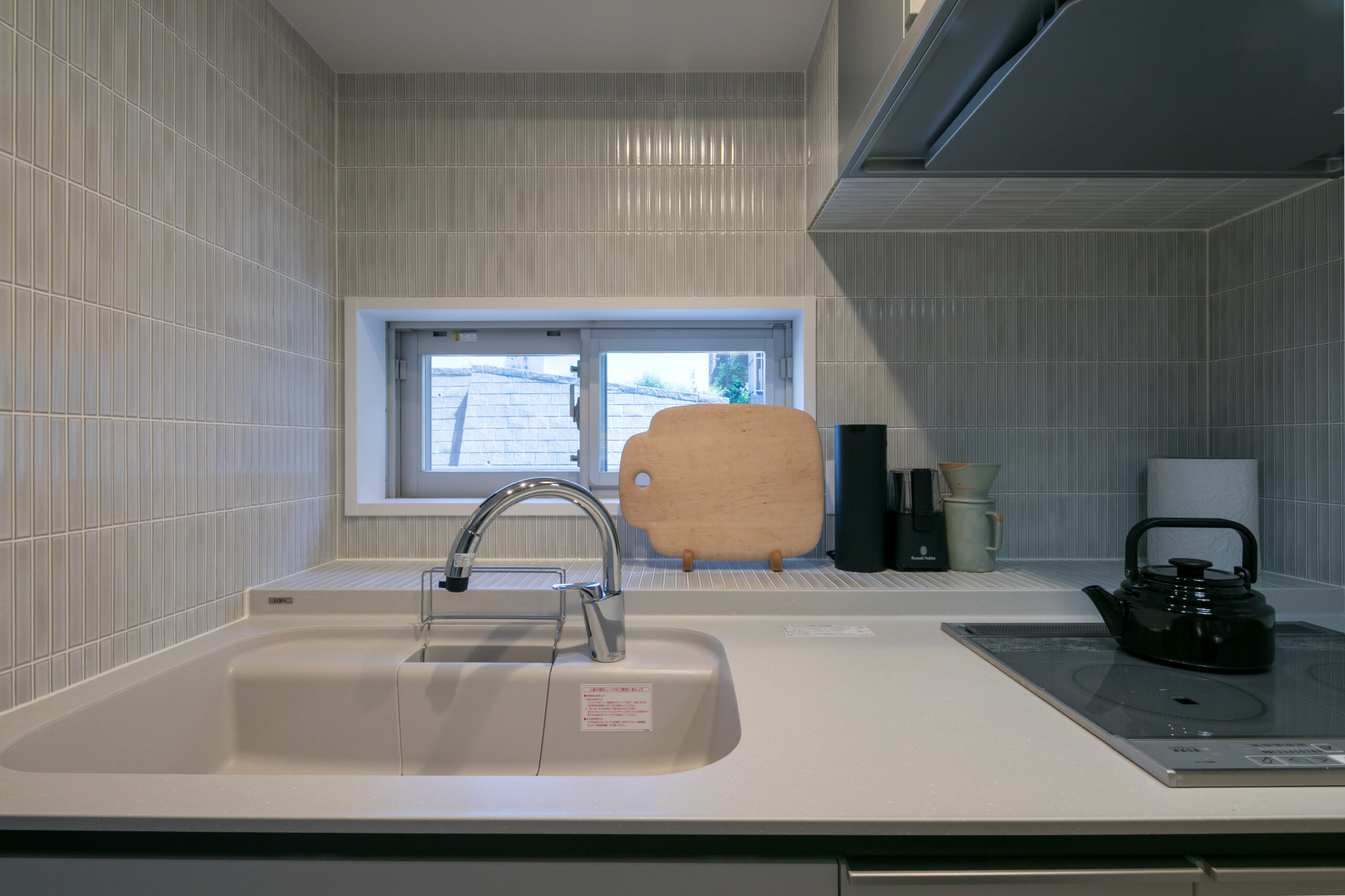 キッチンタイルの貼り分けは、設備や壁との境界がクリーンになるよう