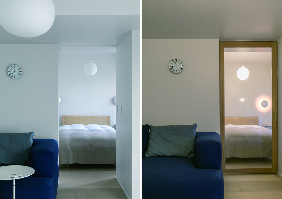 引き戸越しにうつる空間は、昼と夜で違った雰囲気を演出します。