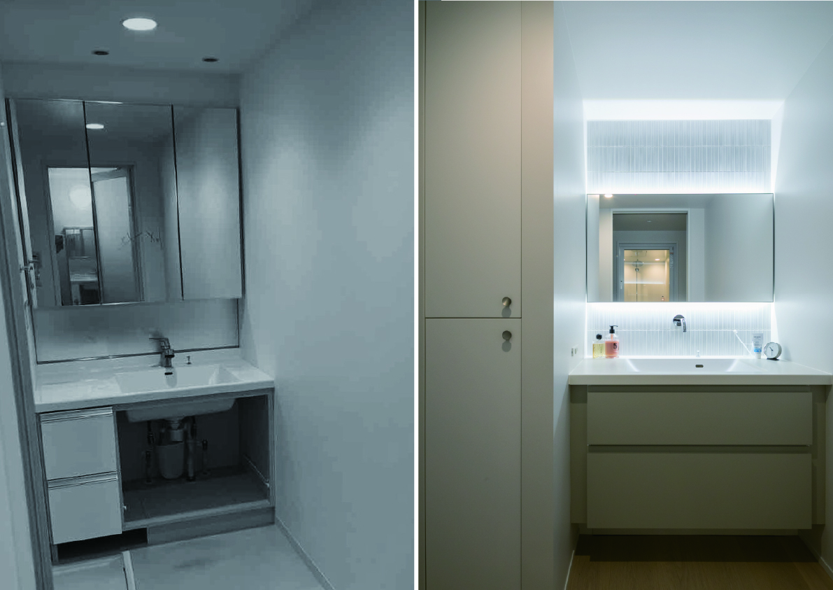持て余していた余分なスペースを無くし、オープンで明るい洗面台スペースへ。