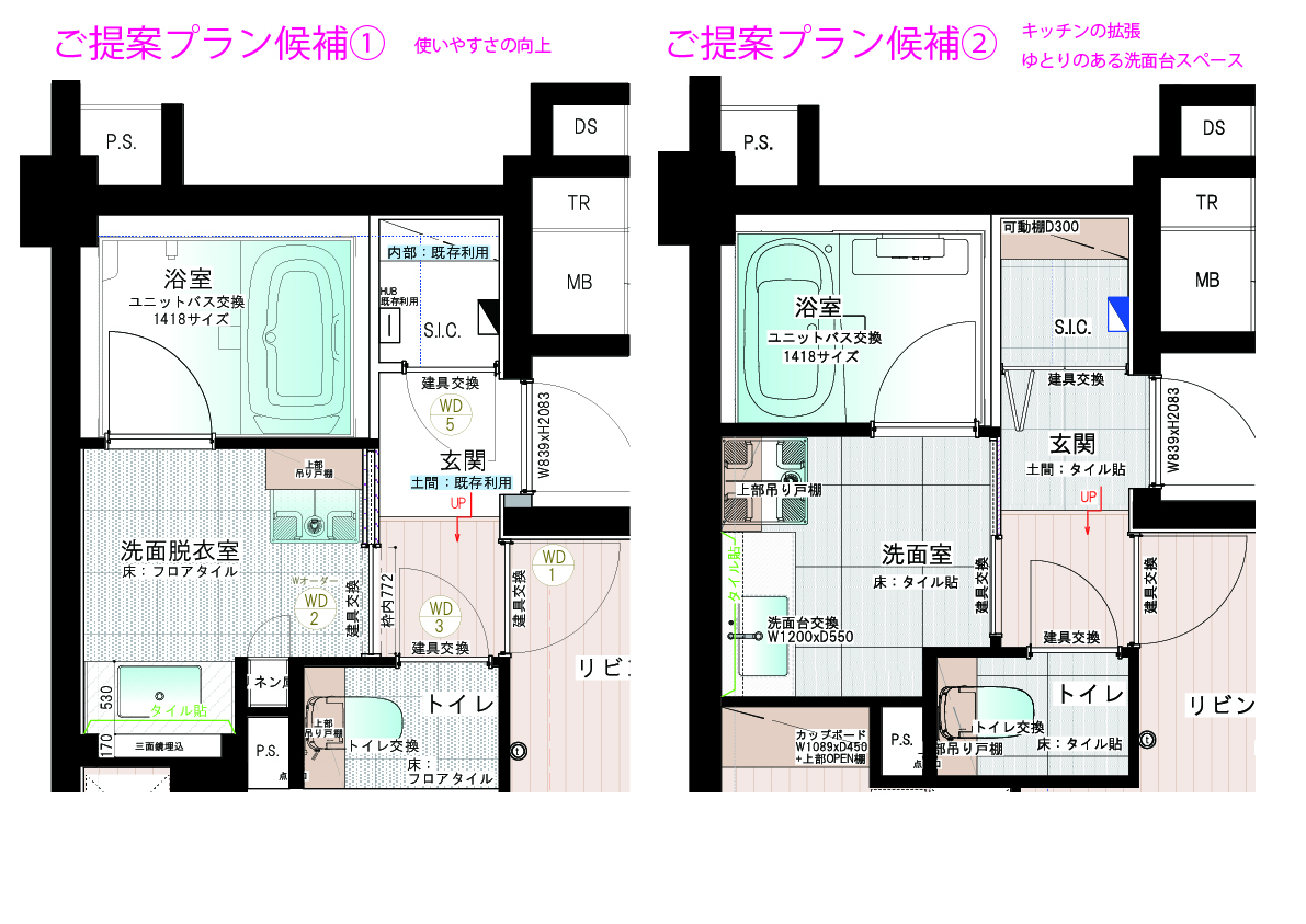 洗面室をコンパクトにし、キッチンを広げるプランもご提案。