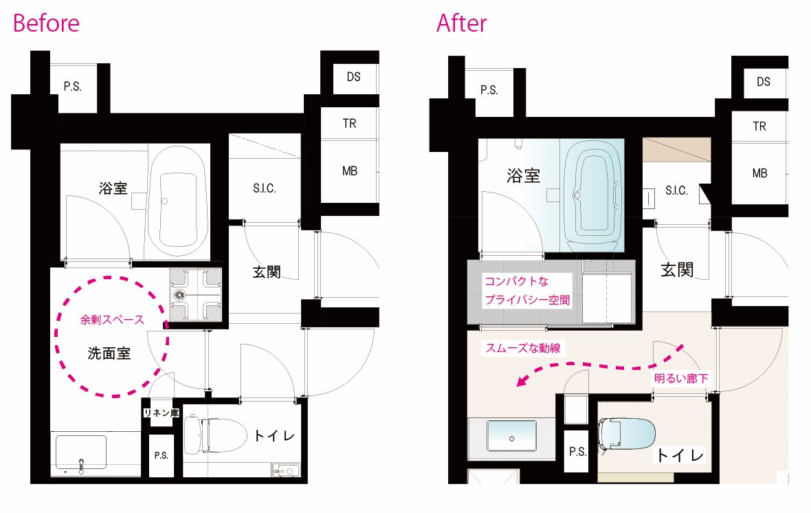 洗面台の位置は変えずに、脱衣室を新たに設けることで動線が向上しました。