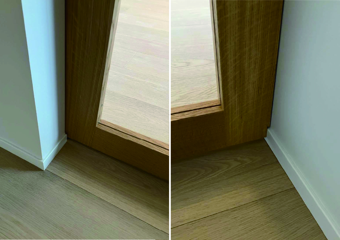 巾木による干渉を避けるため、建具を巾木に合わせて加工し、