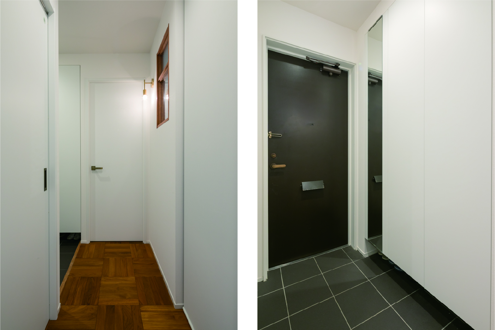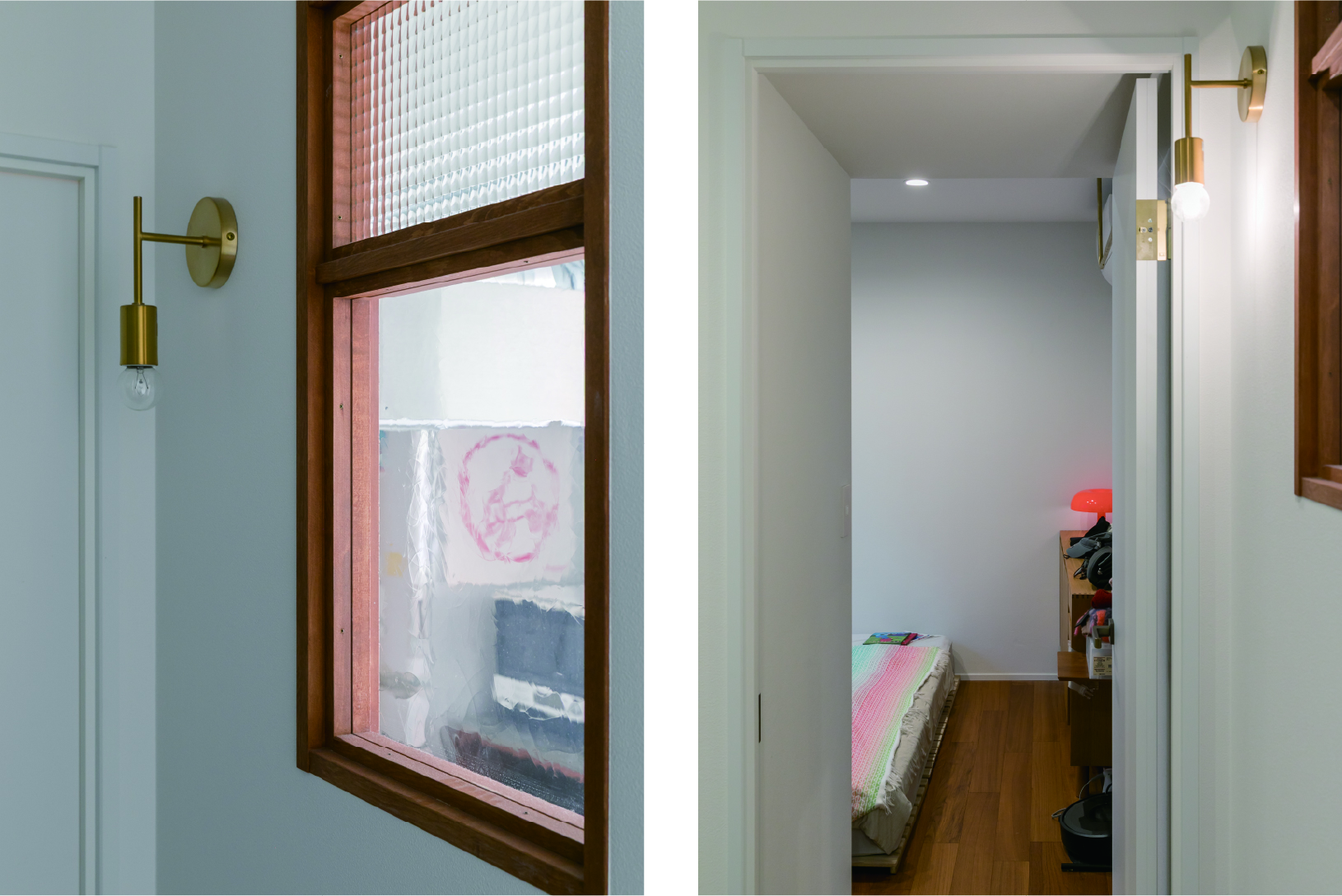 廊下の暗さを解消するために設けた室内窓は、アクセントとしても機能性としても効果的。