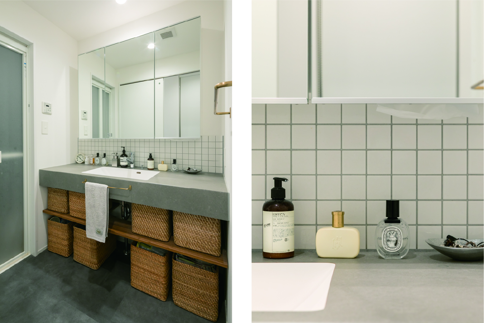 洗面台は当初、長方形のタイルを検討していましたが、提案された正方形タイルのかわいらしさに惹かれ、即決。