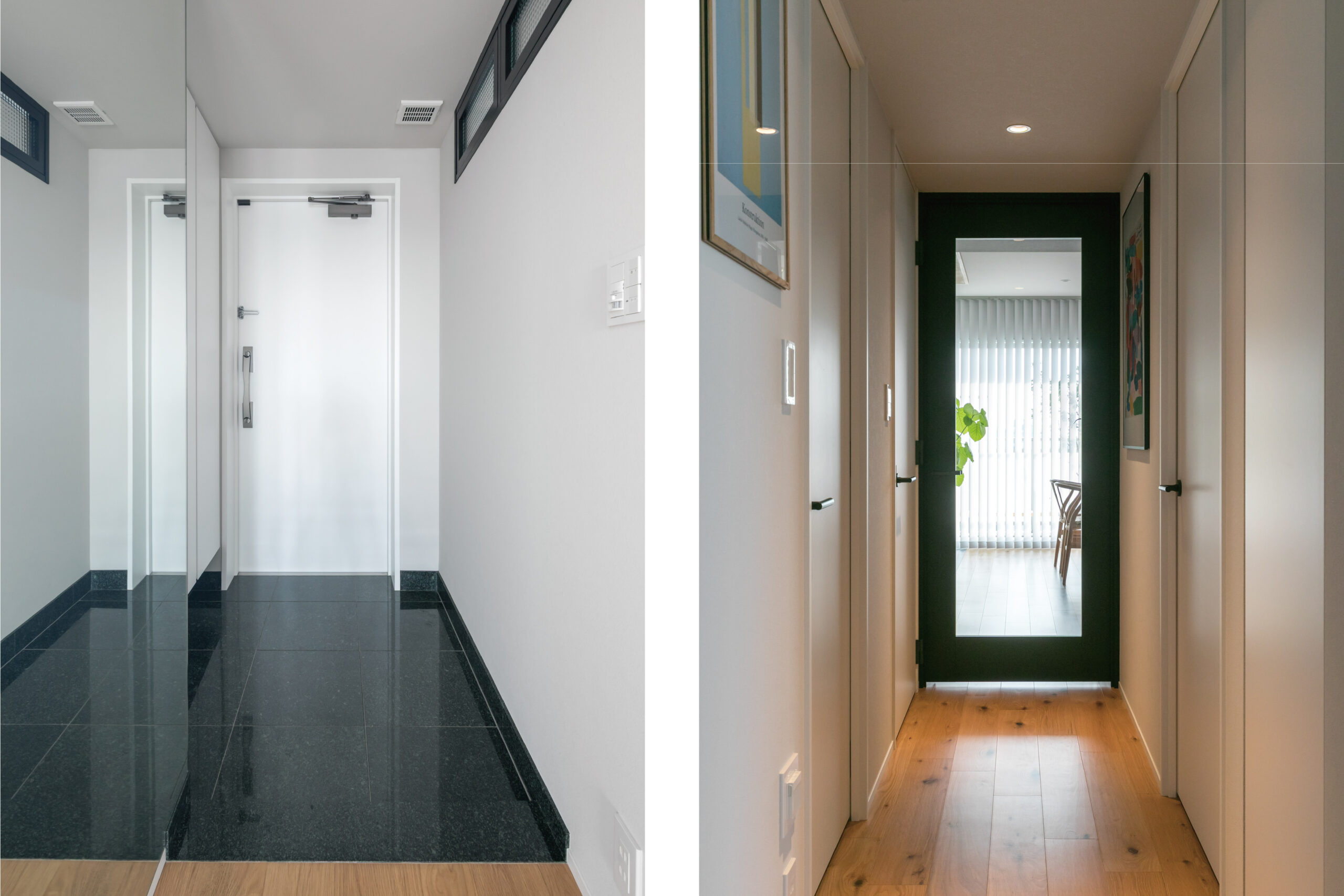 玄関や寝室にも室内窓を取り入れ、デザイン性だけでなく通風や快適性にも配慮しています。