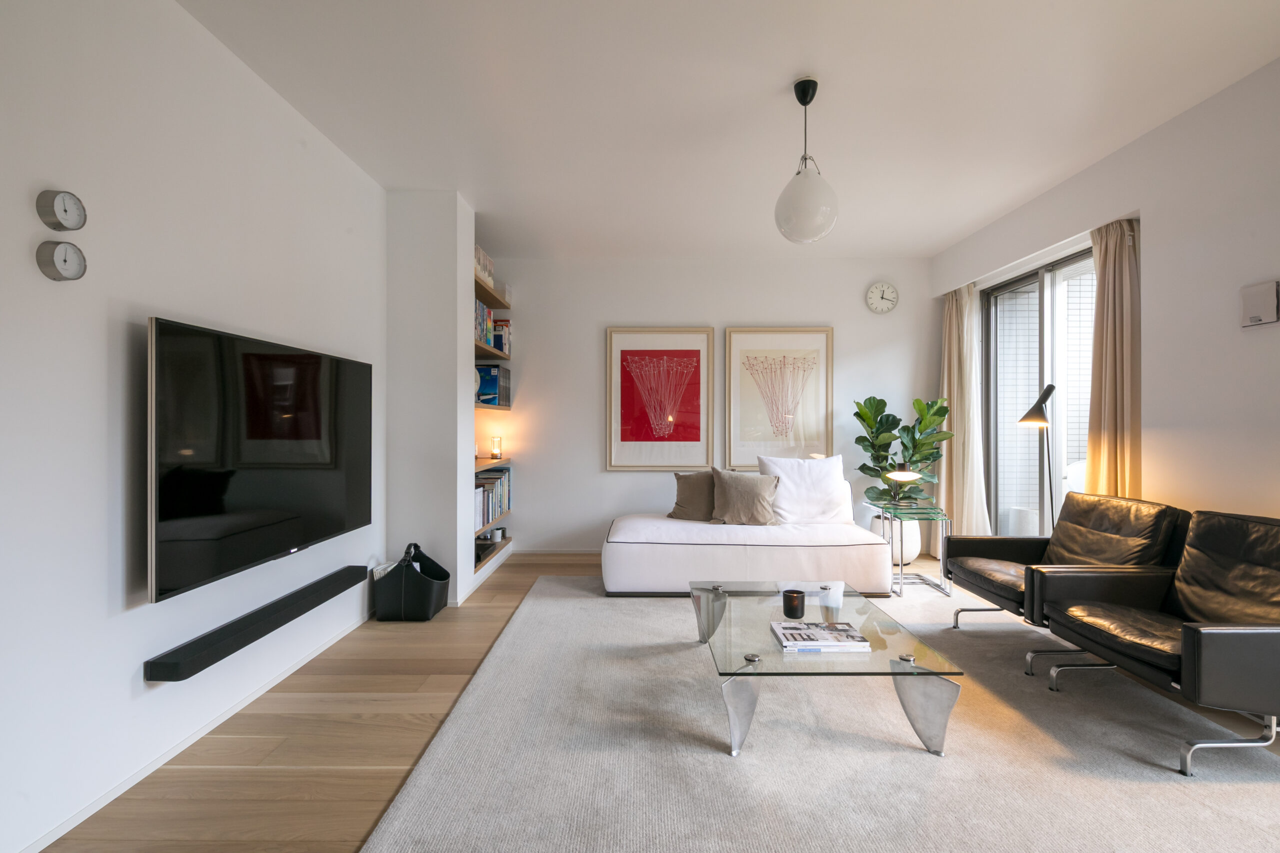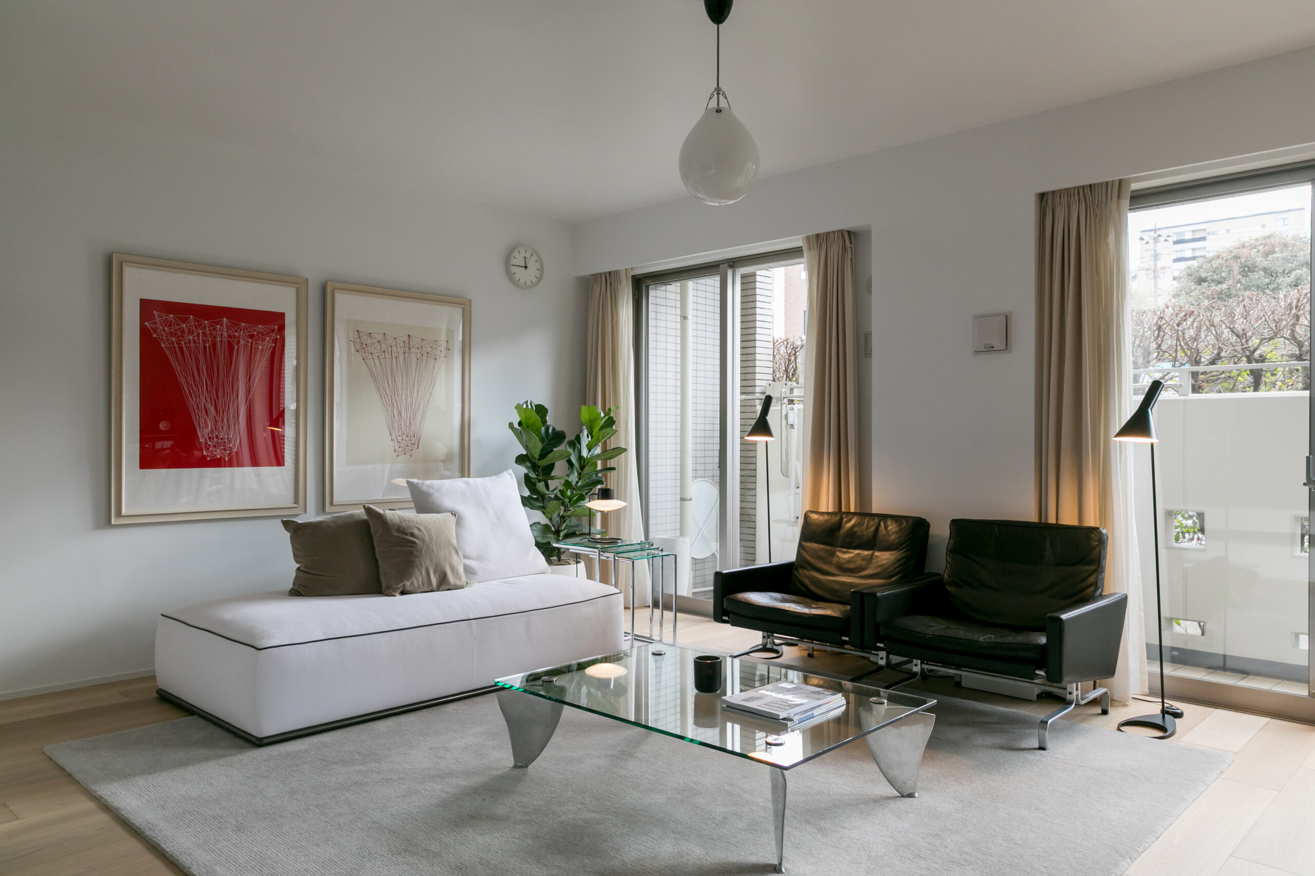 ヴィンテージのポール・ケアホルムのソファを置いても圧迫感のない、贅沢な時間が流れる場所に。