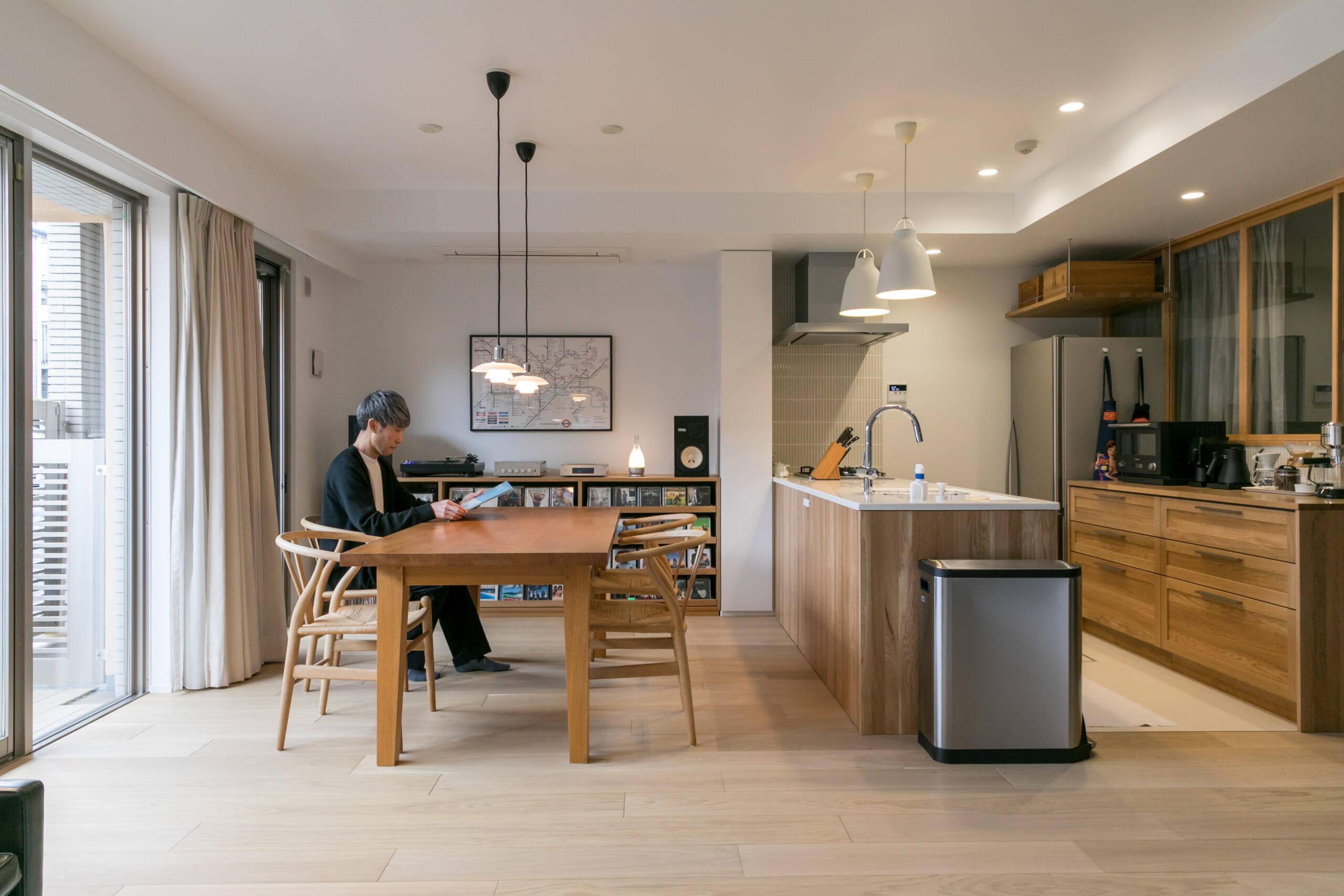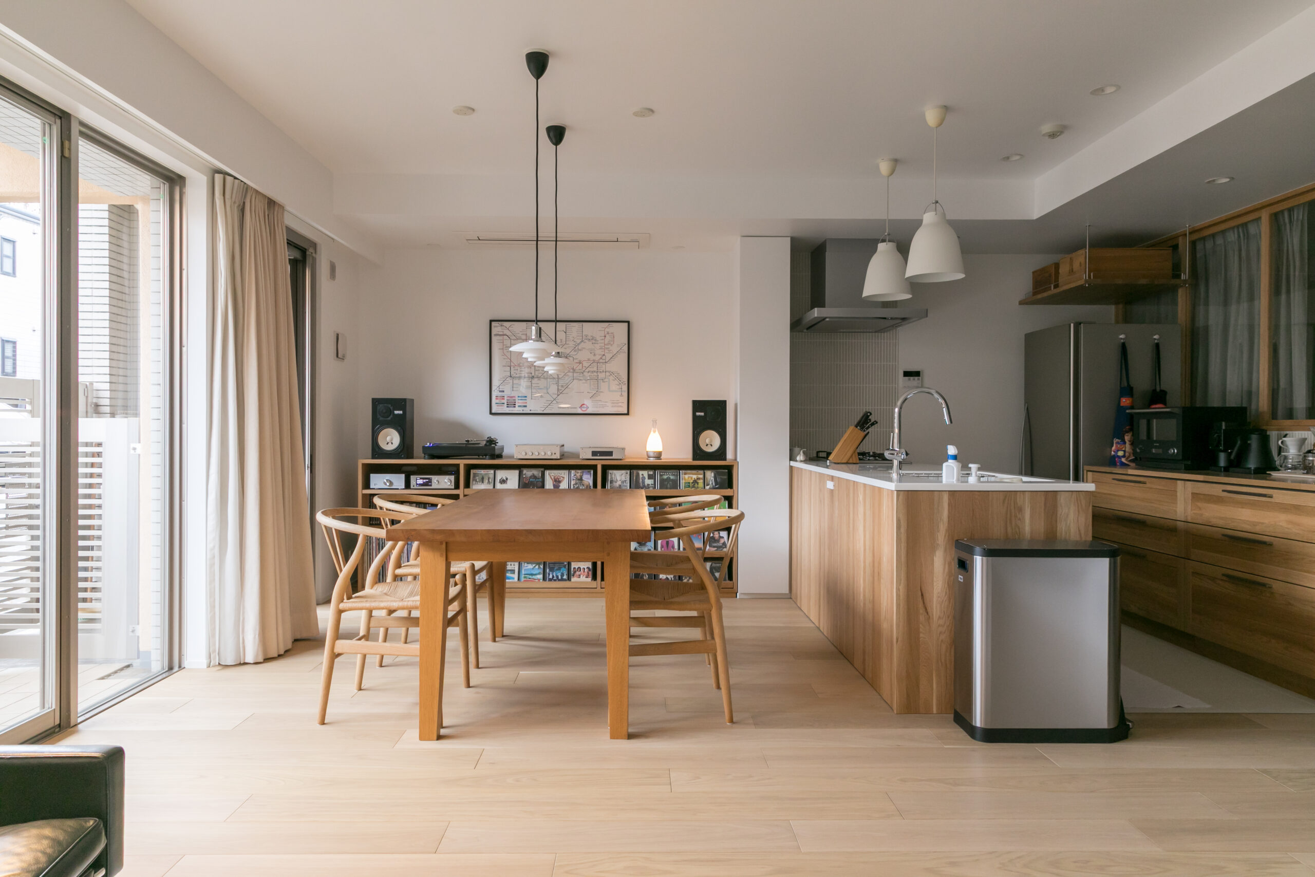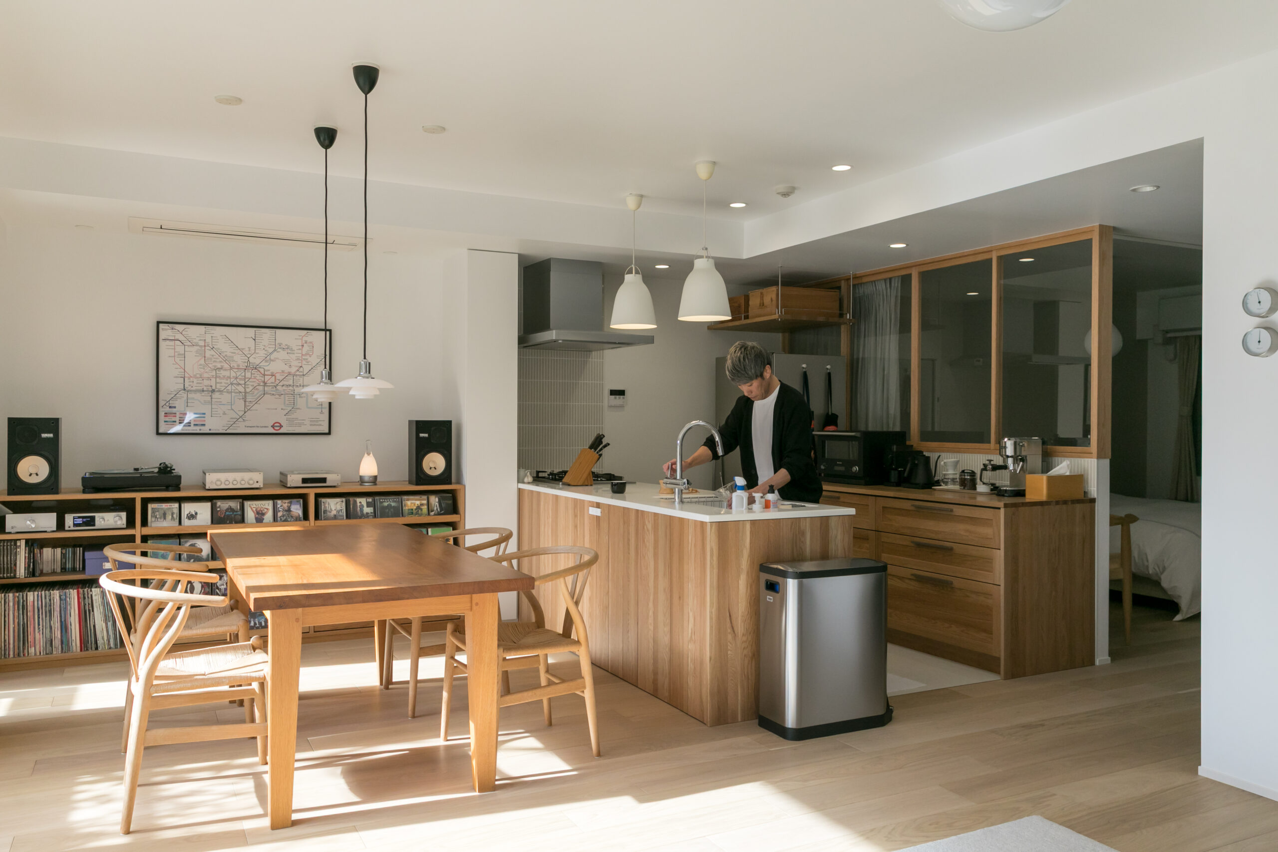 愛用のルイスポールセンの照明やYチェアがより美しく引き立つ構成に。