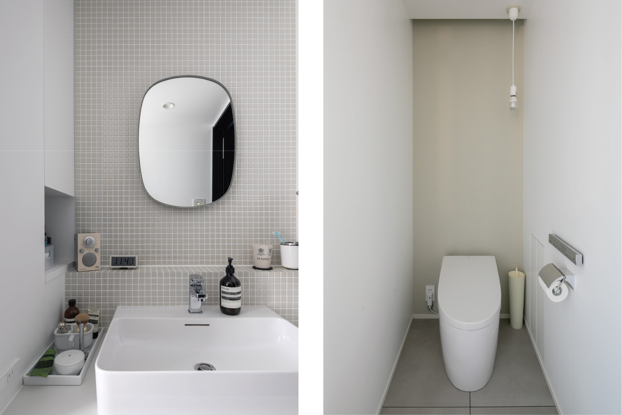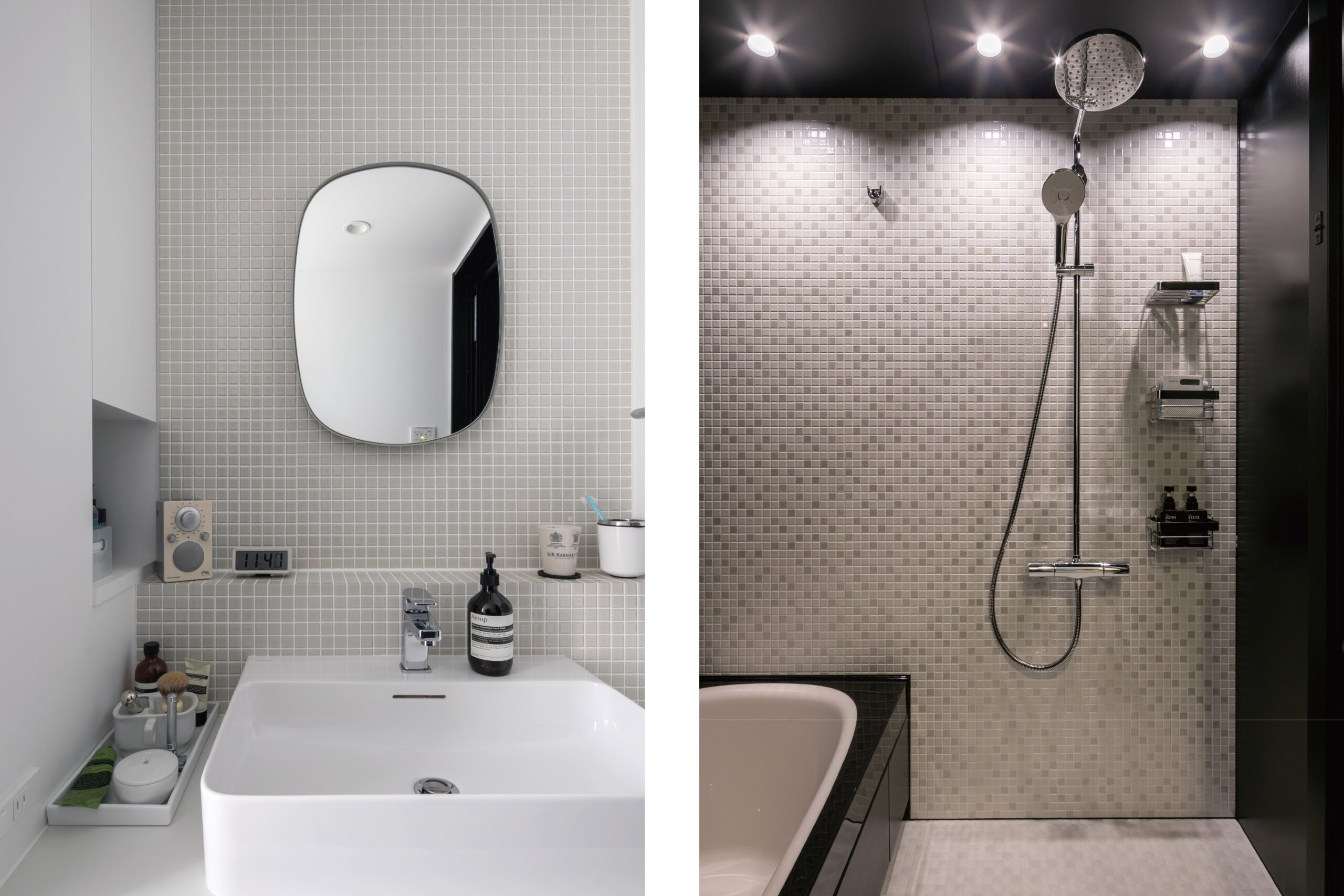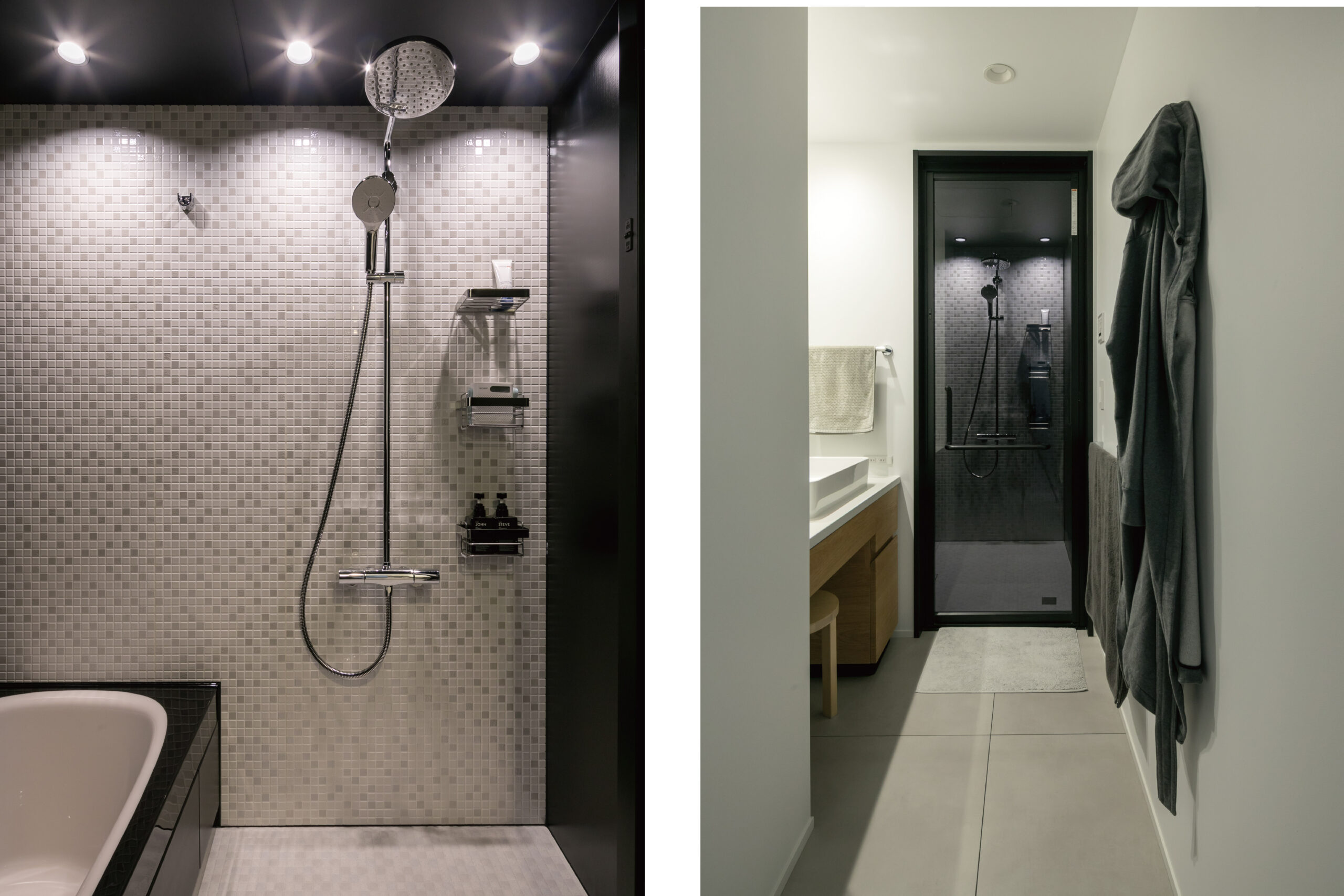 タイル使いが印象的な洗面台や、黒を基調としたバスルームなど、ホテルのような静謐さが漂います。