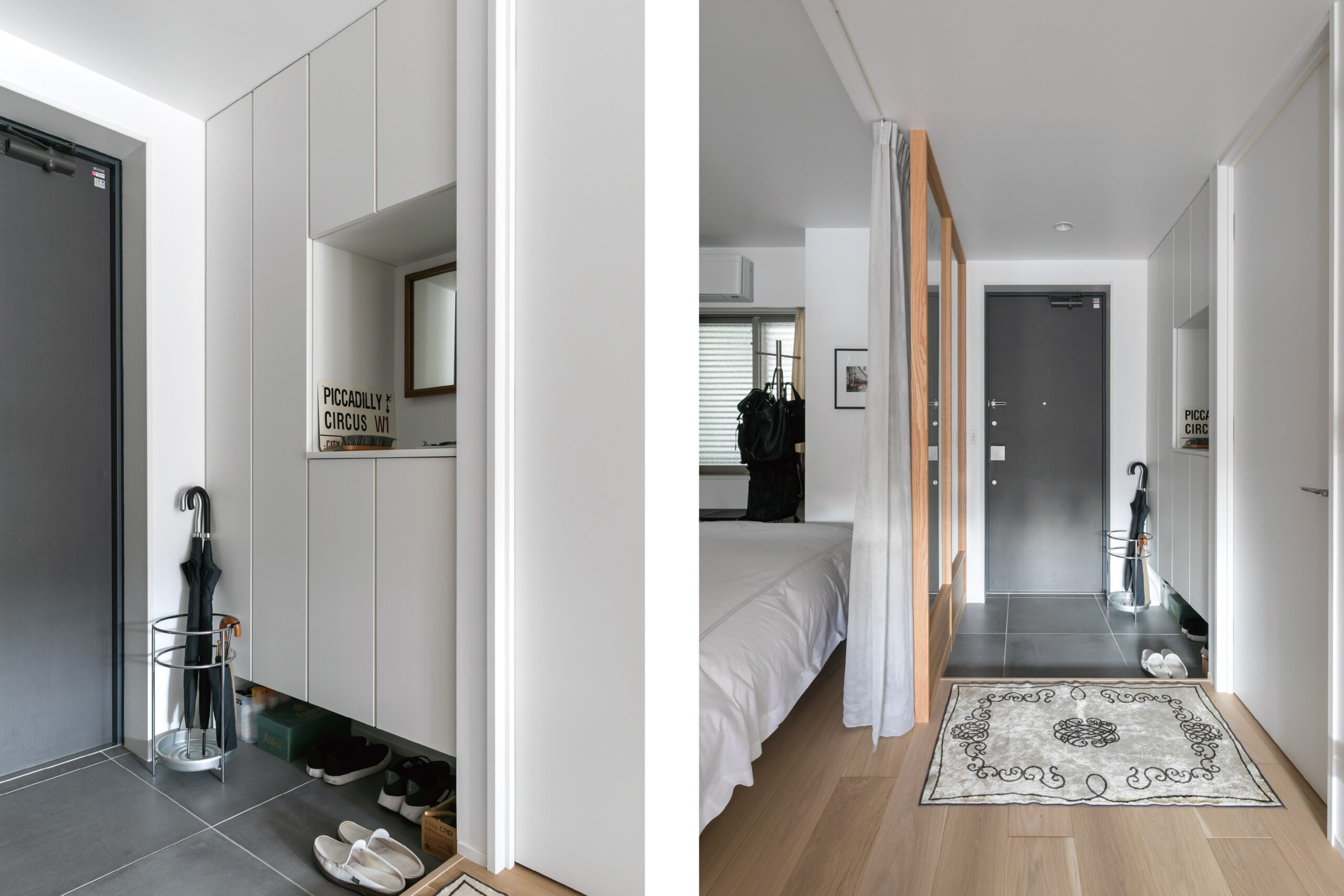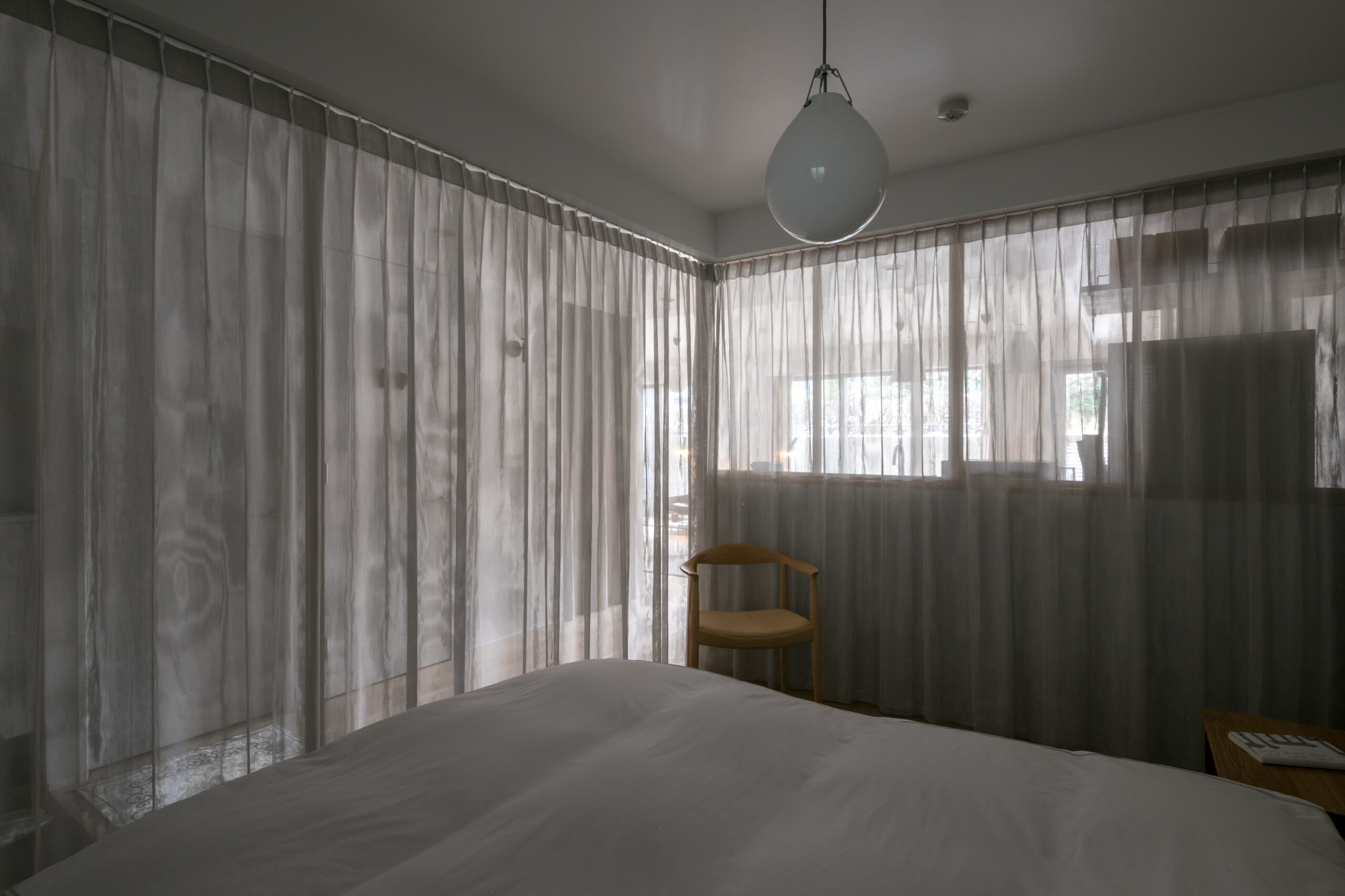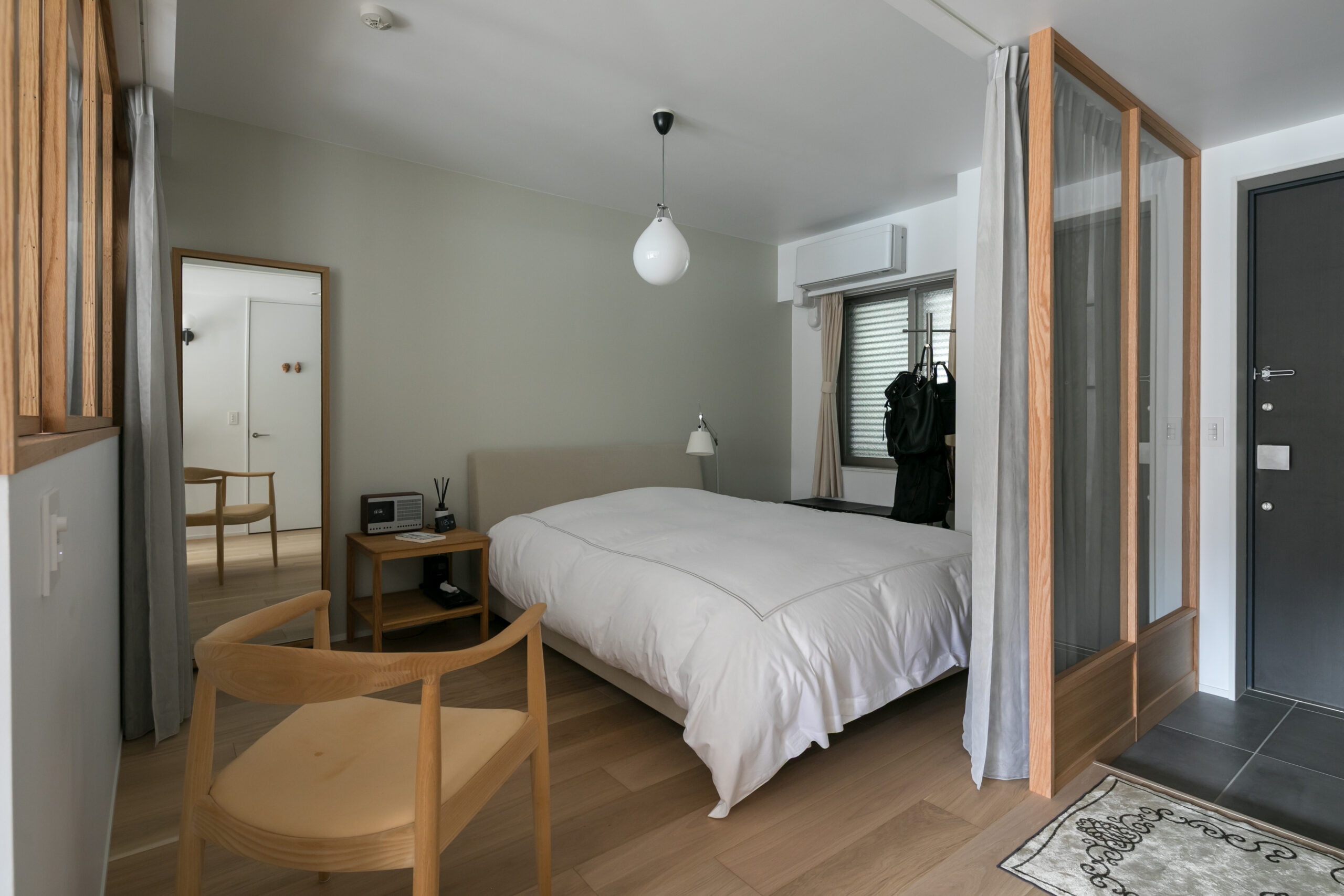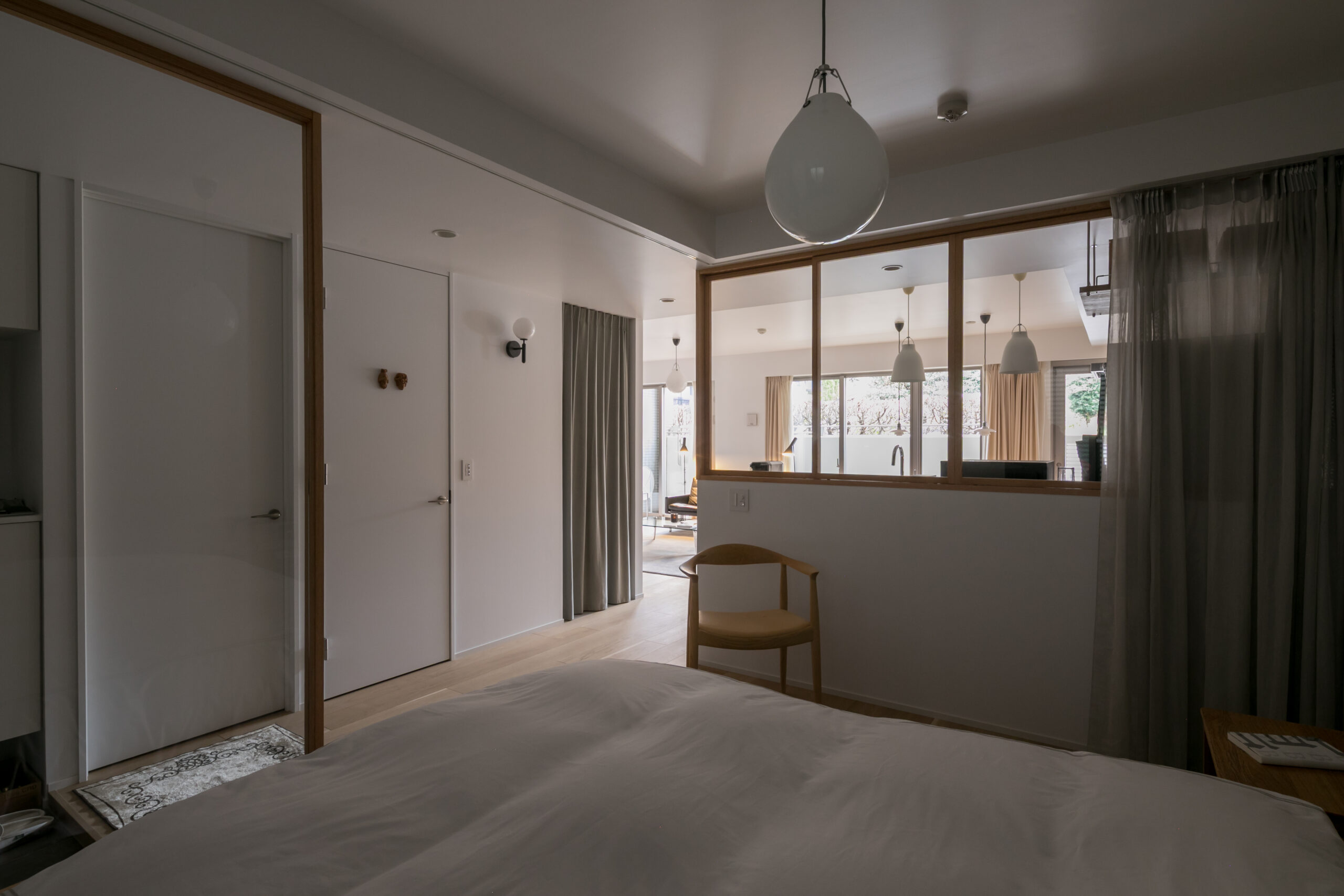 寝室や書斎などのプライベート空間は、建具ではなくカーテンで仕切ることで、