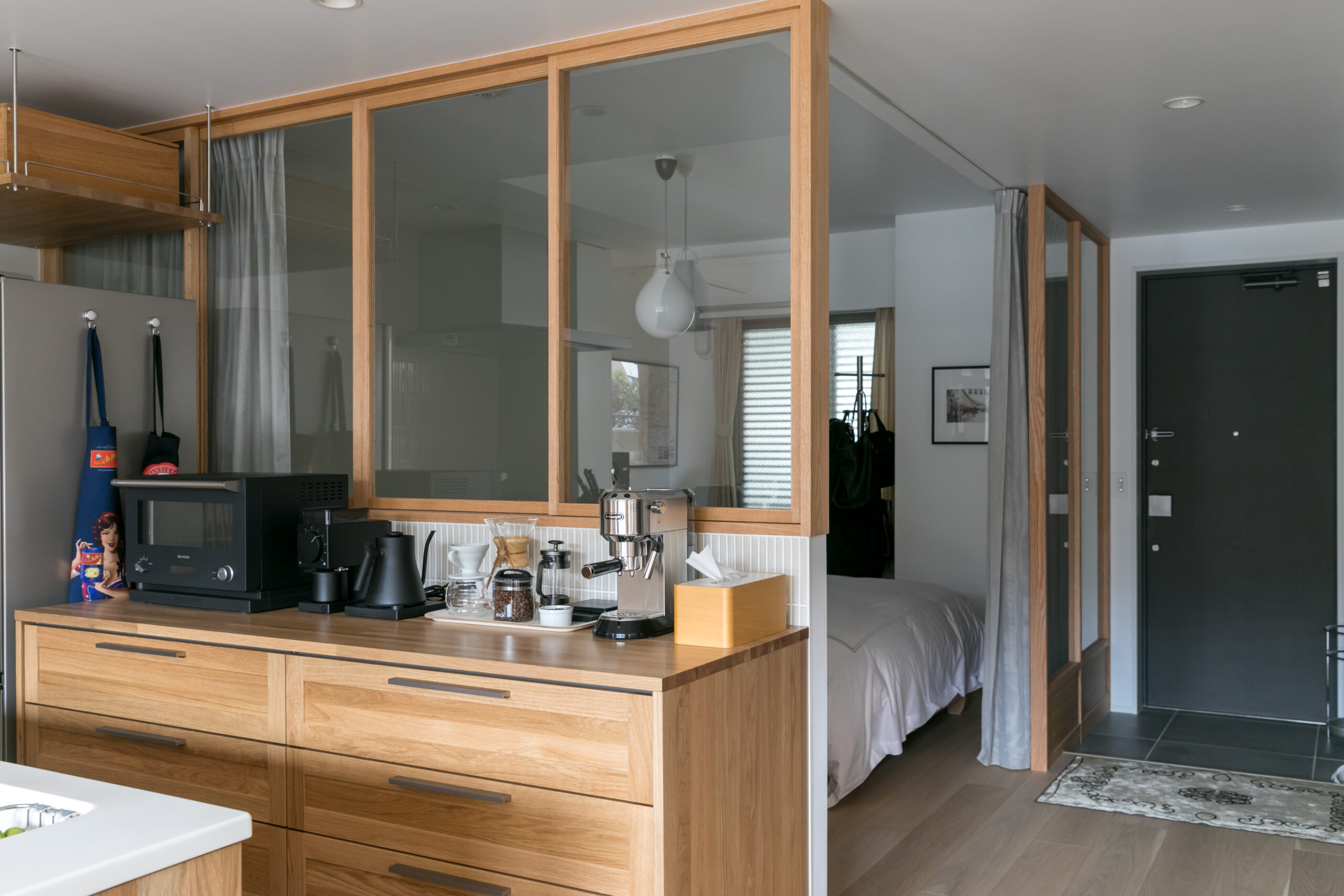 長年の悩みだった「北側の暗さ」は、キッチンと寝室の間に設けた開閉式の室内窓で解決。